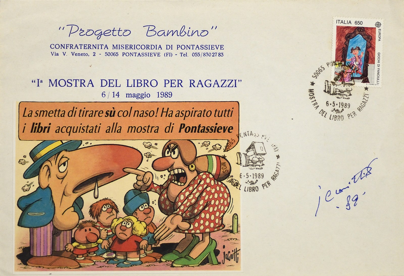 JACOVITTI BENITO (1923 - 1997) Progetto Bambino. Poster. Cm 24,00 x 16,00. Mini poster originale autografato da Jacovitti in occasione della I° Mostra del Libro per Ragazzi. Condizione A.