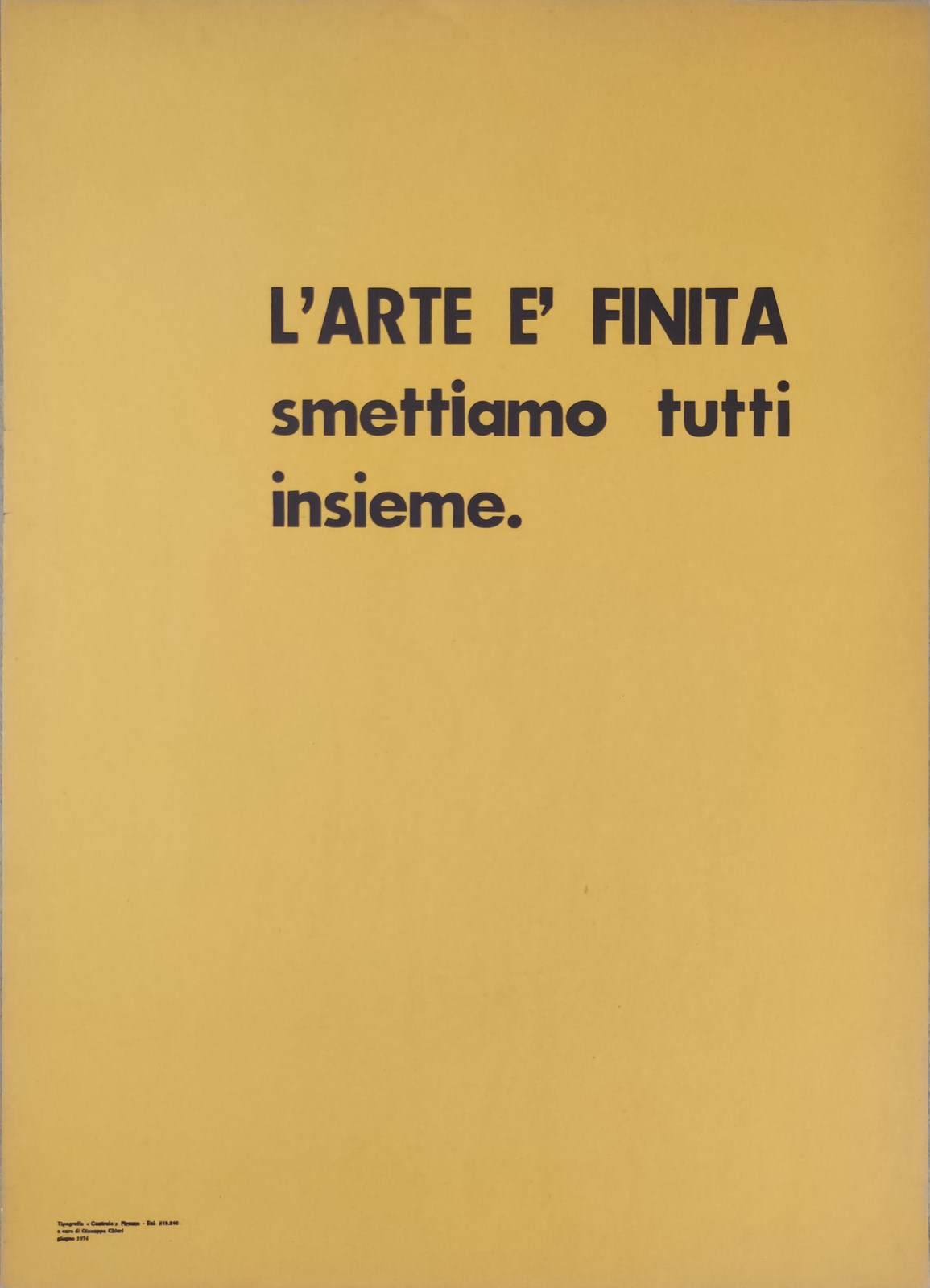 CHIARI GIUSEPPE (1926 - 2007) L'arte è finita smettiamo tutti insieme. 1974. Poster. Cm 70,00 x 100,00. Poster vintage originale. Su fondo giallo. Condizione A.