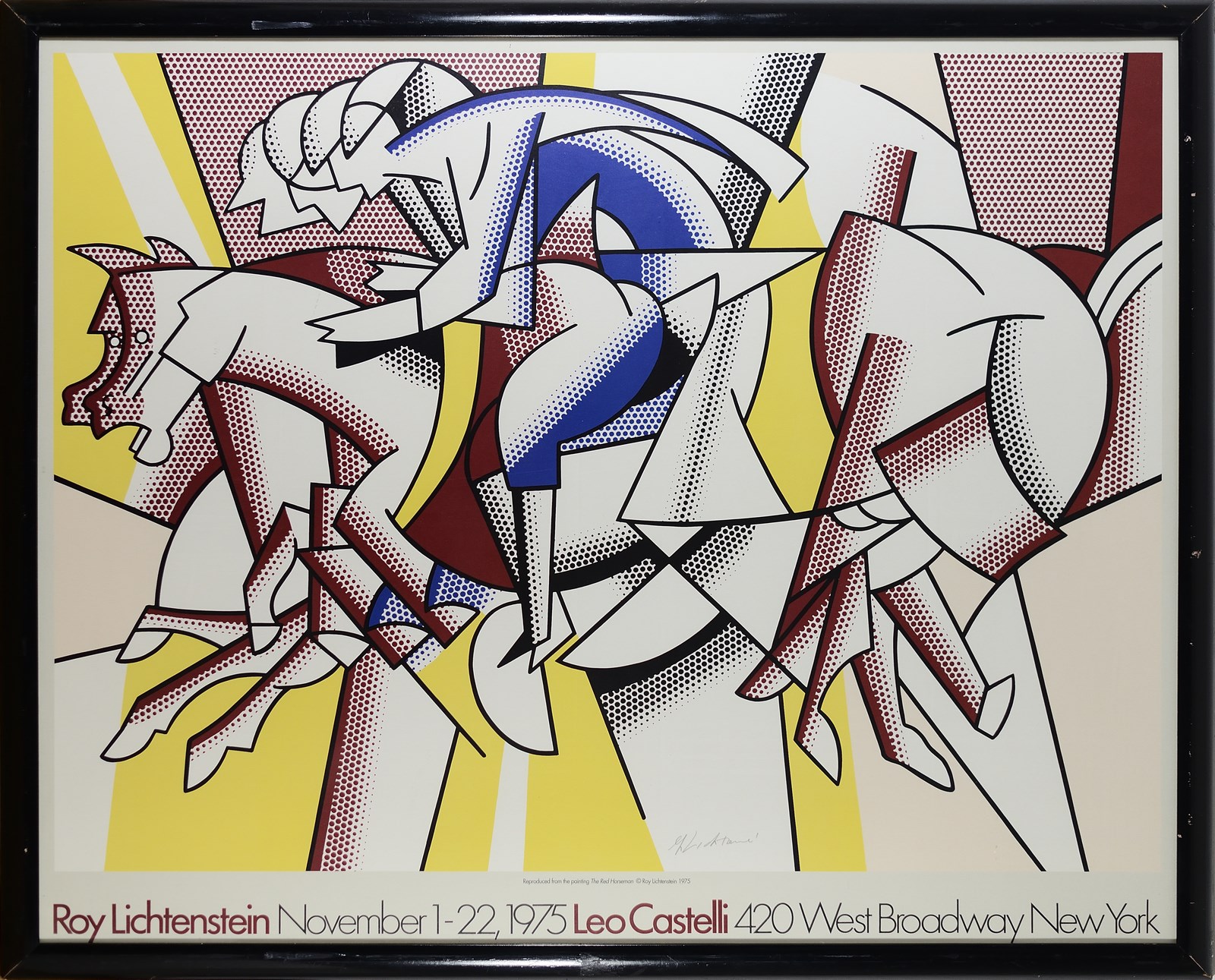 LICHTENSTEIN ROY (1923 - 1997) The red horseman. 1975. Poster. Cm 70,00 x 60,00. Poster manifesto originale vintage mostra da Leo Castelli 1-22 novembre 1975 New York. Frima autografa in basso al centro. Condizione A. Cornice presente