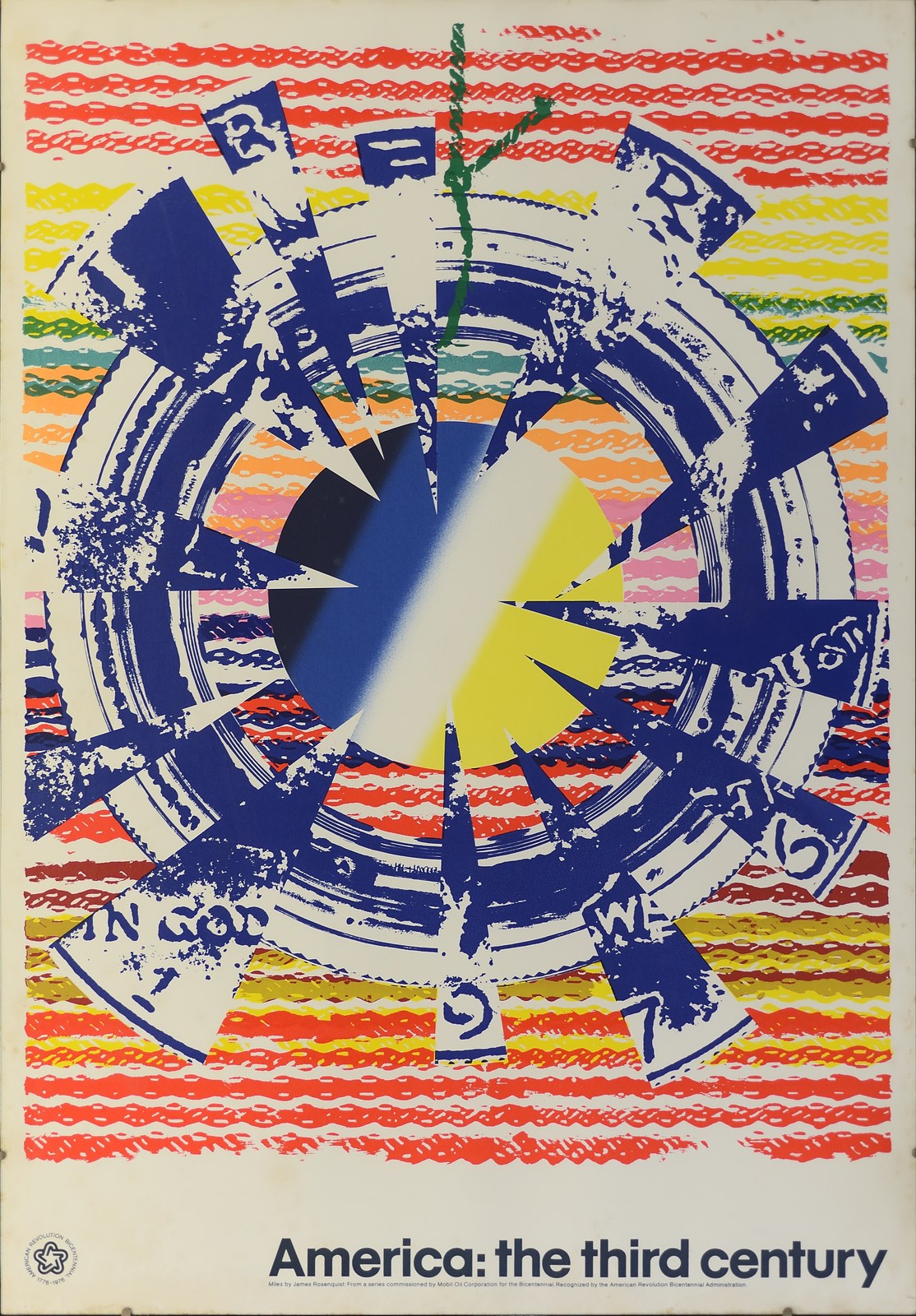 ROSENQUIST JAMES (1933 - 2017) Miles from James Rosenquist. 1976. Poster. Cm 61,00 x 89,00. Poster vintage originale mostra Rosenquist in occasione del bicentenario dell'American Revolution, per Mobil Oil. Condizione A meno. Cornice presente