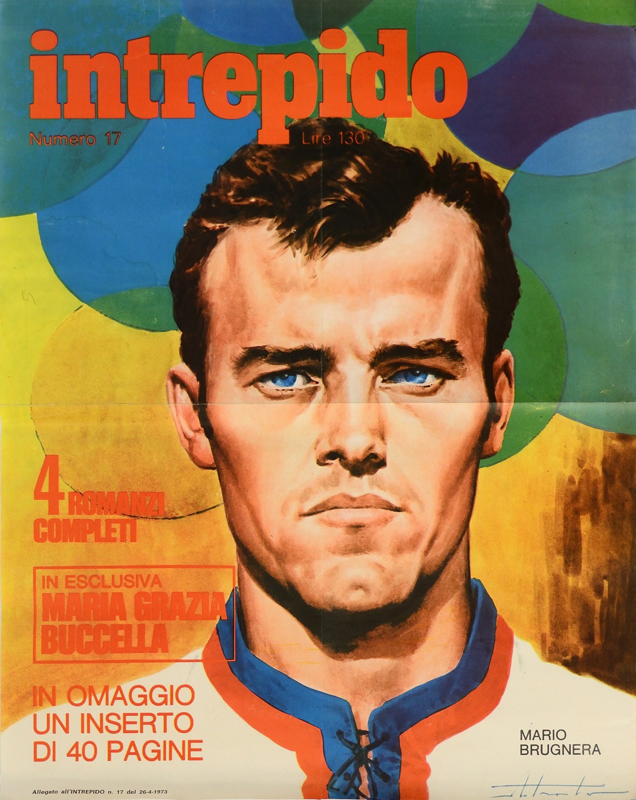 INTREPIDO Giornale a fumetti da esposizione con Mario Brugnera. Poster. Cm 30,00 x 40,00. Giornale a fumetti vintage originale con il giocatore del Cagliari Mario Brugnera. Condizione A.