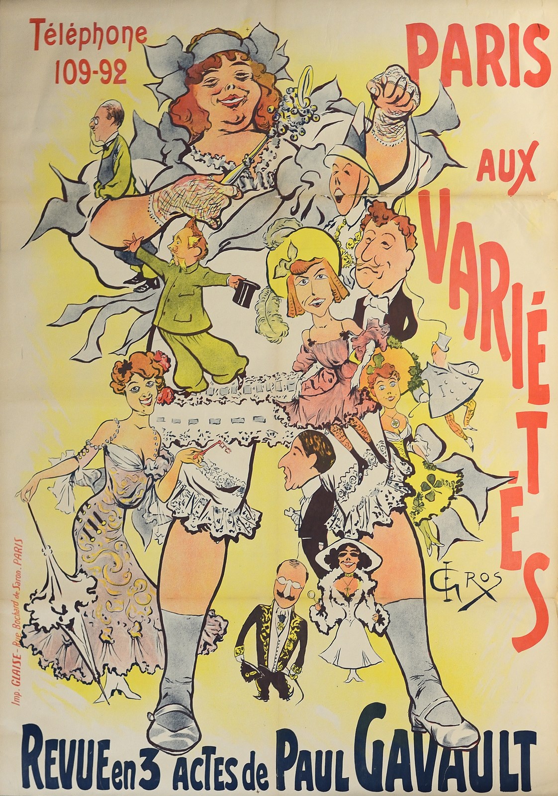 GROS Parigi, manifesto teatrale. (Paris aux variétés). Poster. Cm 120,00 x 160,00. Poster vintage originale. Stampatore Glaise, Parigi. Condizione A.
