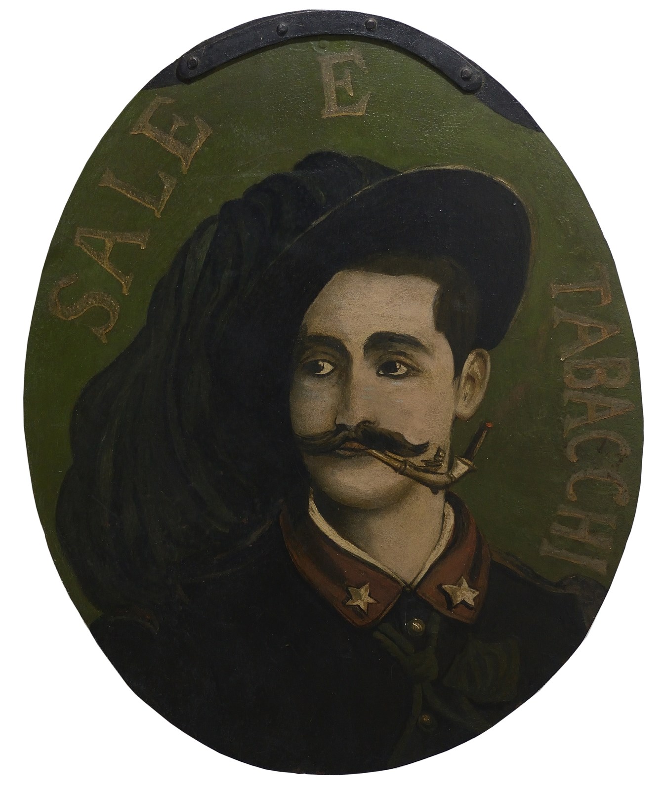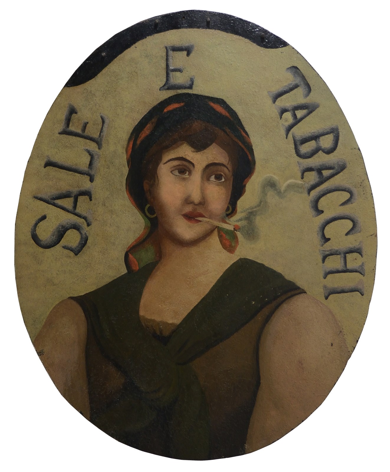 AUTORE NON IDENTIFICATO Sali e Tabacchi. Olio su metallo,. Cm 58,00 x 70,00. Insegna dipinta in metallo vintage originale di forma ovale. Condizione A.