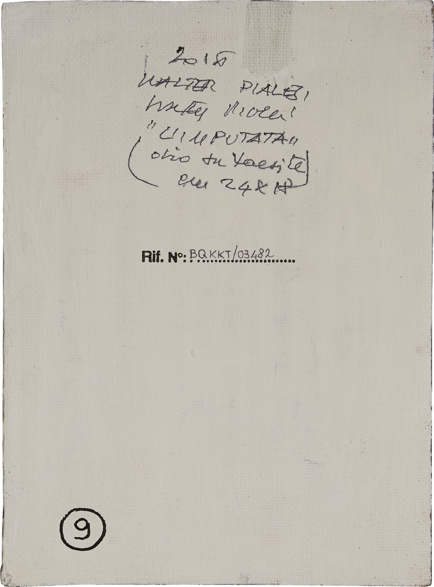 Data, firma, titolo, tecnica, misure e Rif. n. BQKKT/03482 sul retro
