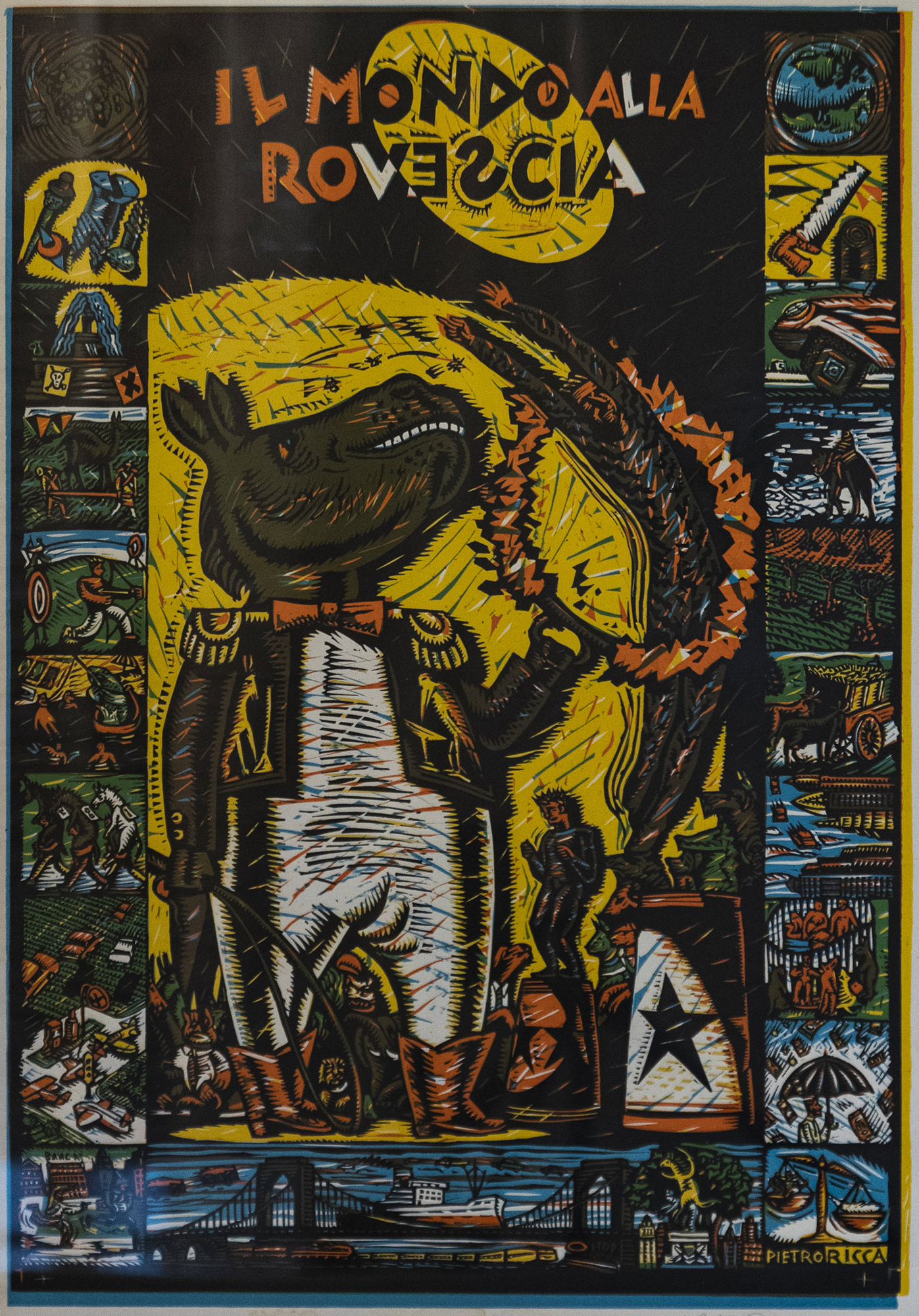 Pietro Ricca - Italia - Il mondo alla rovescia - Stampa a 4 colori da matrici di linoleum (colori primari + nero) - 70x50 cm