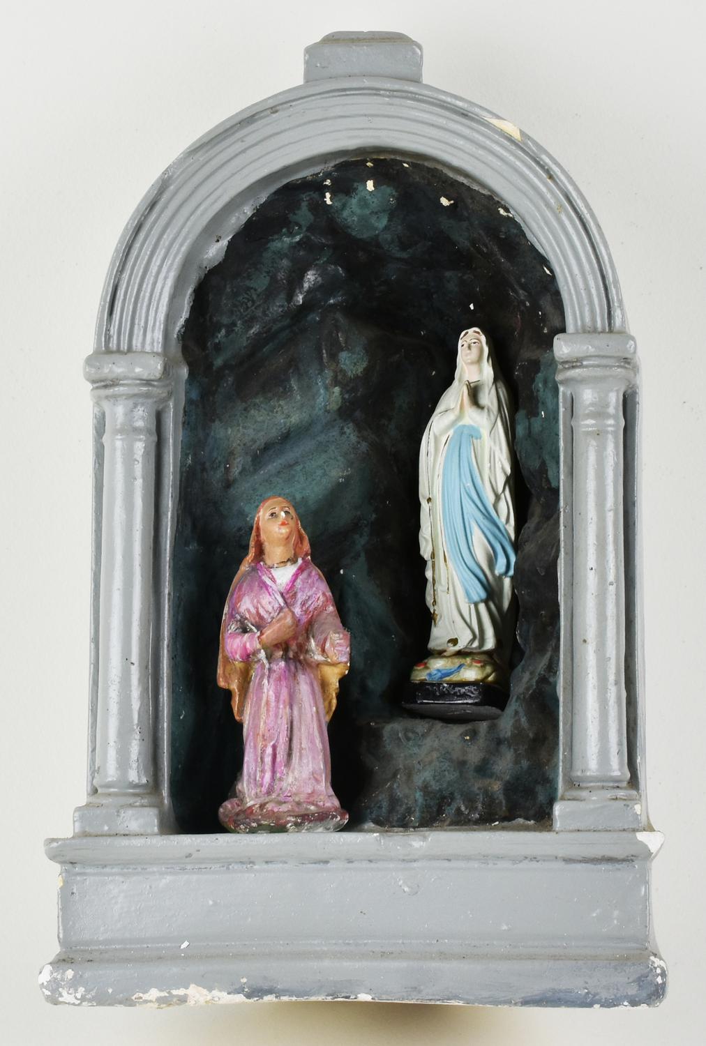 in gesso raffigurante la Madonna di Lourdes con Bernadette entro la Grotta, opera di arte popolare