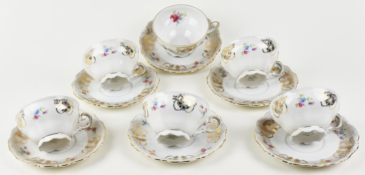 in porcellana marca Seltmann modello Theresia decorata a motivi floreali e filettature in oro zecchino composto da 6 tazze con piattino