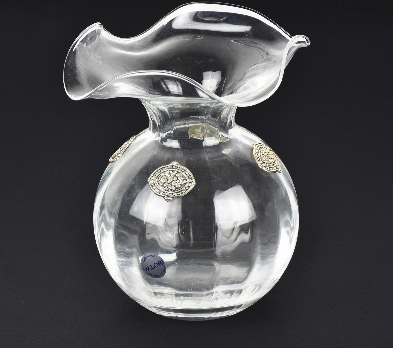 VASO IN VETRO con decorazioni in argento Sterling 925 alt. cm 18