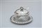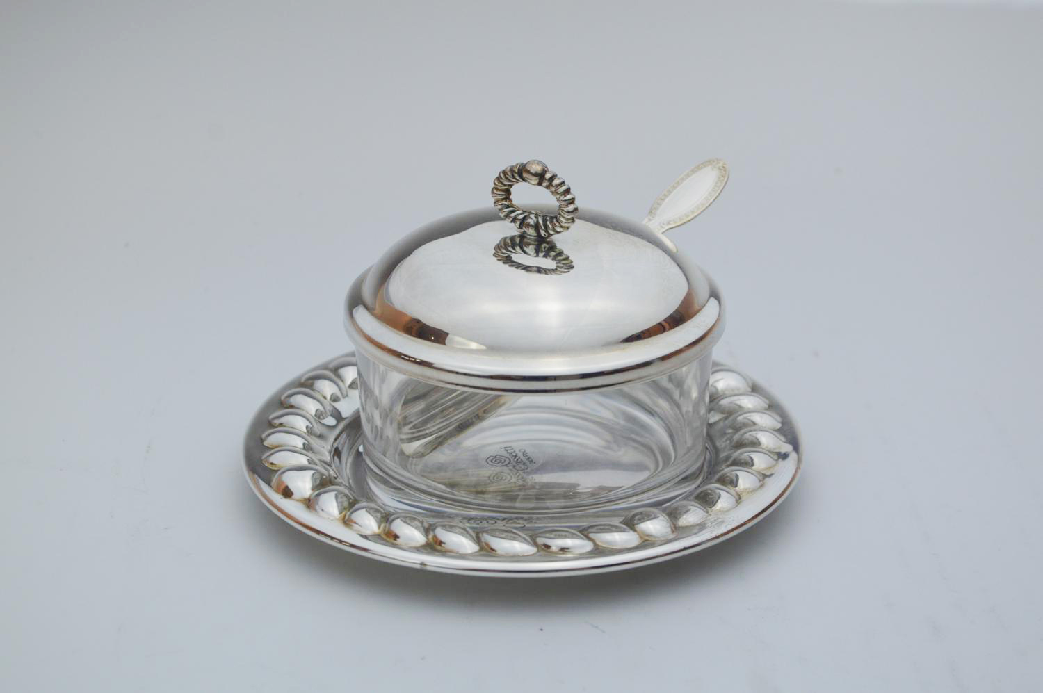 di forma rotonda, costituita da una ciotola in vertro entro struttura in argento, completa di cucchiaino in argento 800