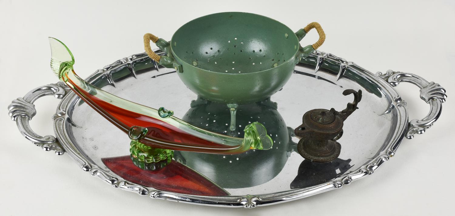 Lotto 164 | LOTTO DI OGGETTI VARI composto da: - Vassoio in acciaio polilobato in stile...