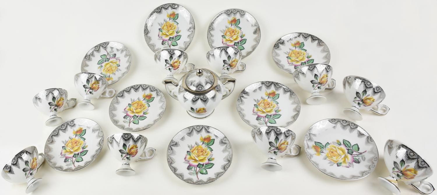 con decorazioni in argento e piccole rose composto da zuccheriera e 10 tazzine con piattino