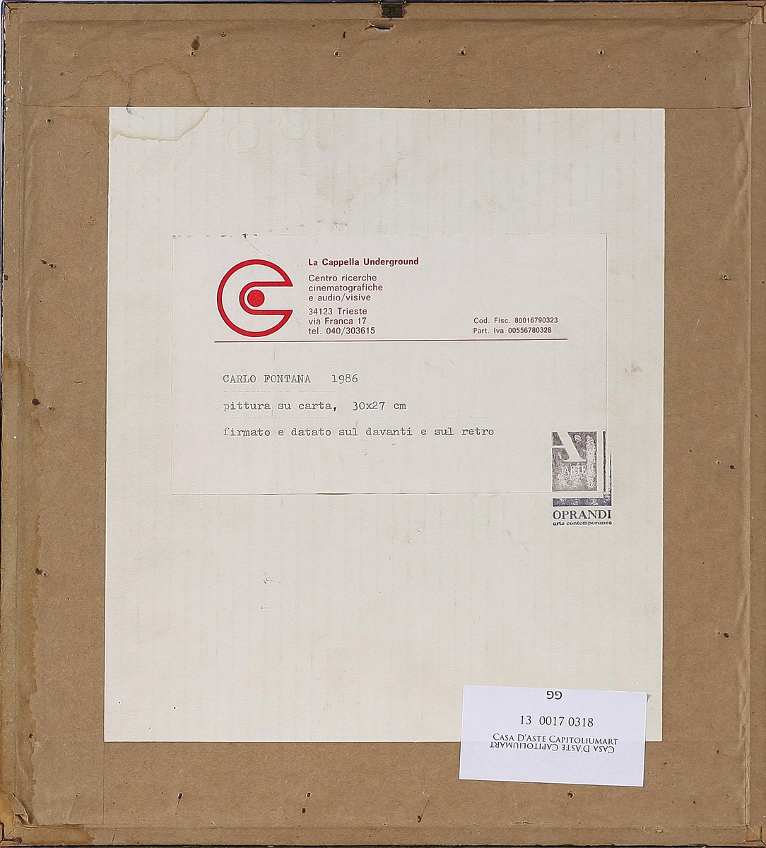 FONTANA CARLO (n. 1951) Senza titolo. 1986. Tecnica mista su carta. Cm 27,00 x 30,00. Firma e data in basso a destra. Firma al retro. Sul cartone di supporto al retro cartiglio - La Cappella Underground, Trieste - e timbro - Oprandi Arte Contemporanea, Bergamo. . Cornice presente