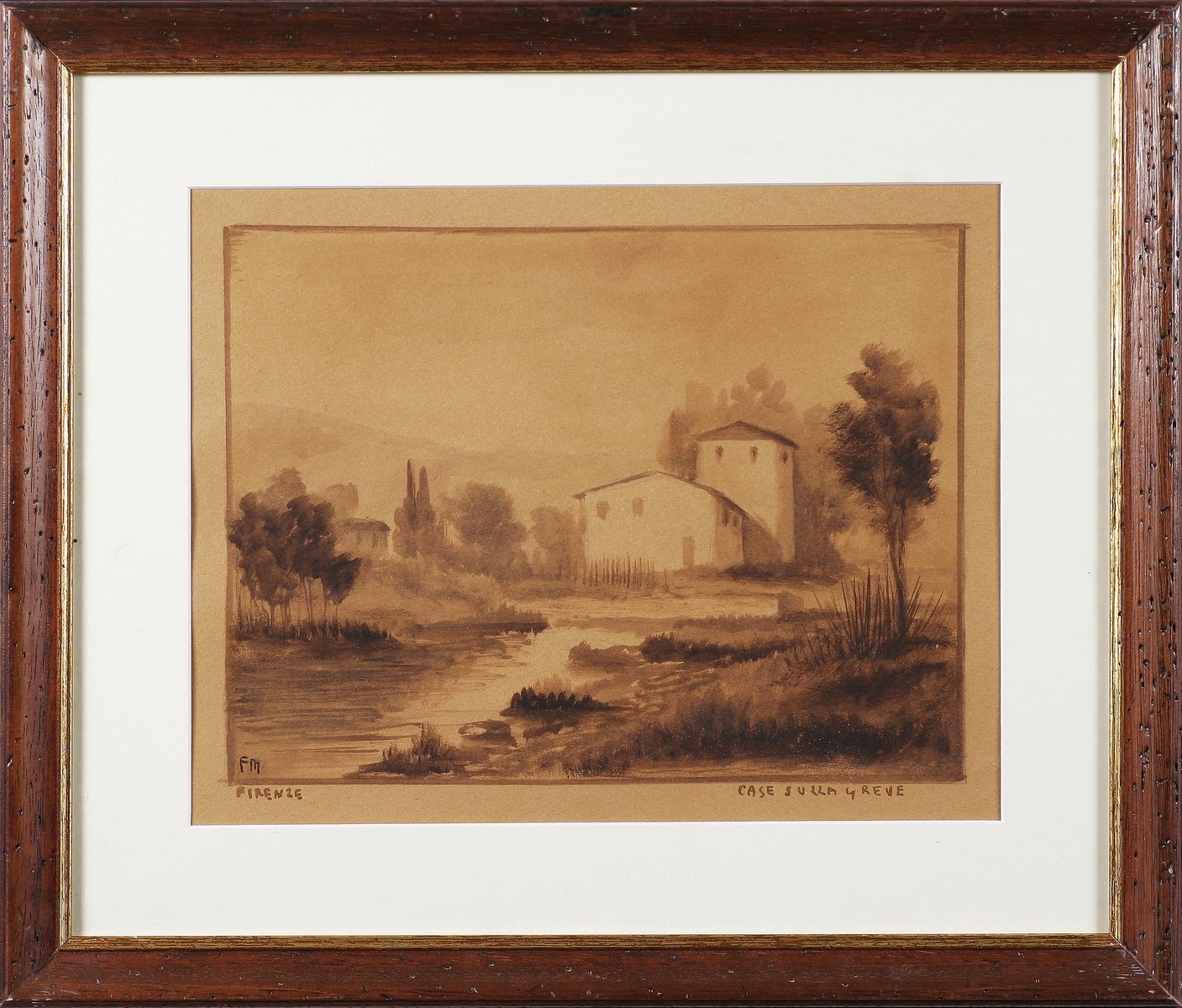 MAGNI FAUSTO (1906 - 1985) Case sulla grave. Tecnica mista su carta. Cm 33,00 x 26,00. Monogrammato in basso a sinistra, titolo in basso a destra. Autentica a cura della Galleria Rigacci, Firenze. Cornice presente