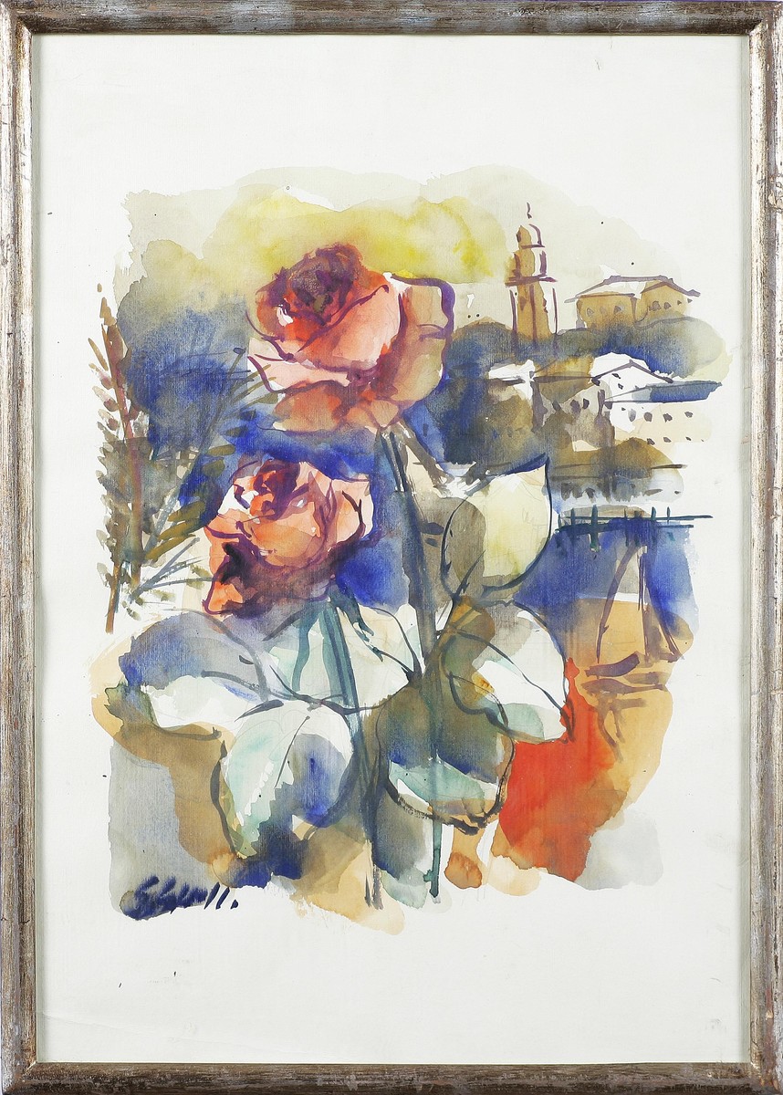 CAPPELLO EMANUELE (n. 1936) Rose. Acquerello su carta . Cm 35,00 x 50,00. Firma in basso a sinistra. Cornice presente