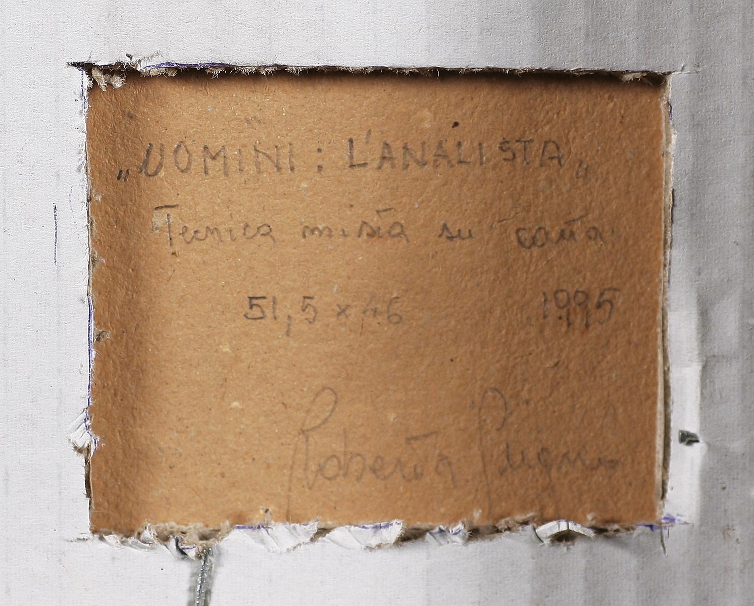 PUGNO ROBERTA Uomini: l'analista. 1995. Tecnica mista su carta. Cm 39,00 x 34,00. Al retro titolo, firma tecnica e anno. Cornice presente