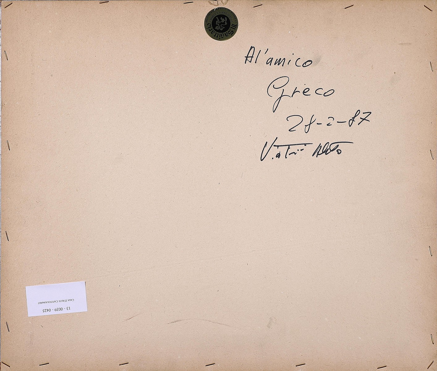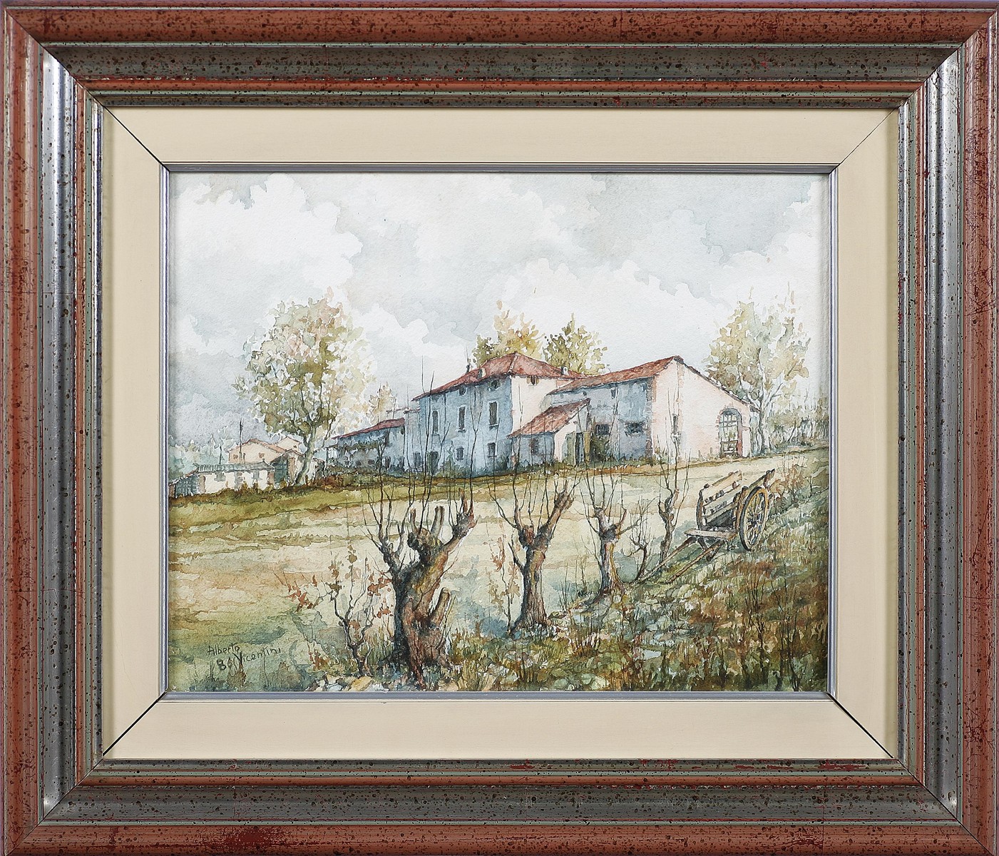VICENTINI ALBERTO (1904 - 1983) Cascinale. 1986. Acquerello su cartone. Cm 35,00 x 27,00. Firma e data in basso a sinistra. Al retro dedica e firma. Cornice presente