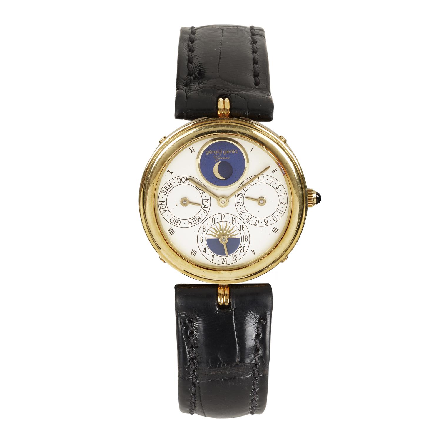 orologio da polso, automatico, in oro giallo 18 k, con datario, giorno della settimana, fasi lunari e secondo fuso orario, chiusura deployante in oro 18 k Gerald Genta, corredato di garanzia e libretto delle istruzioni