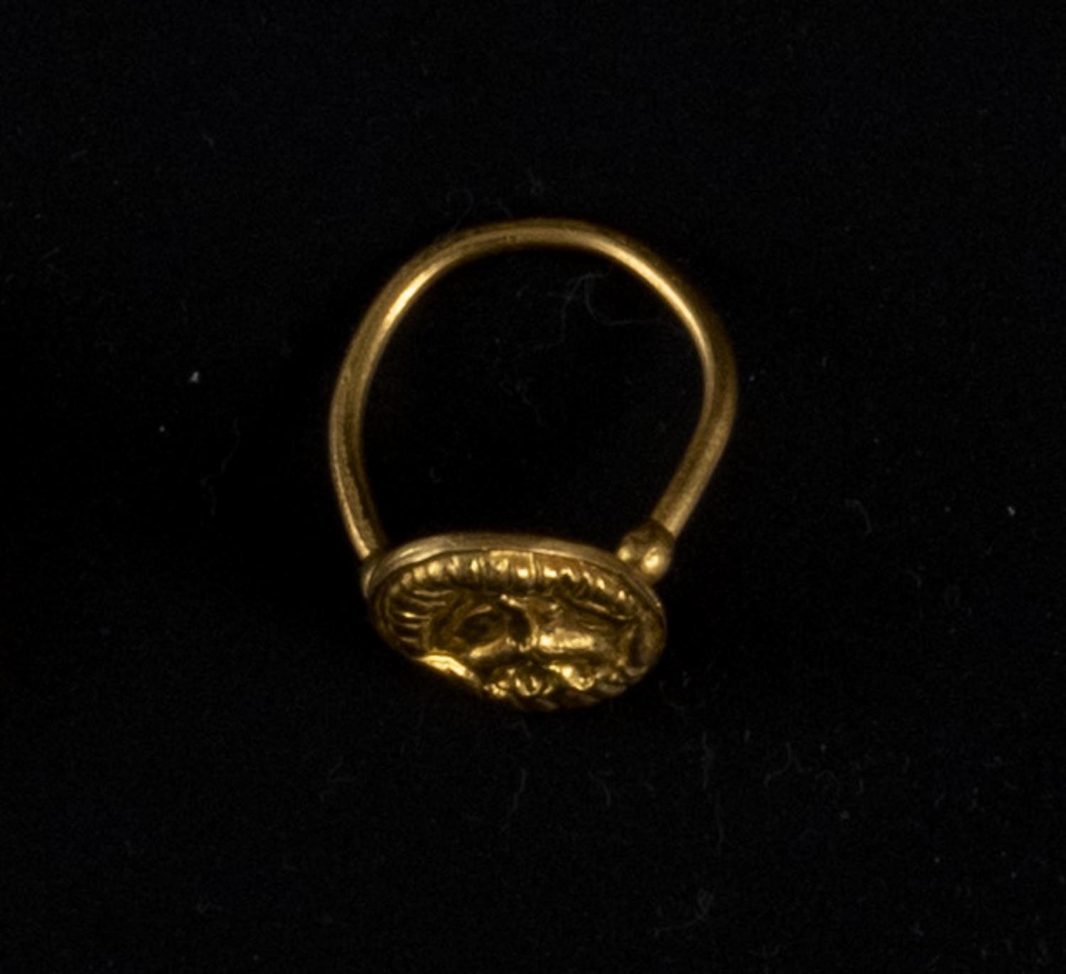 Anello in verga d'oro con castone ovale su cui è sbalzato un volto barbato di satiro.