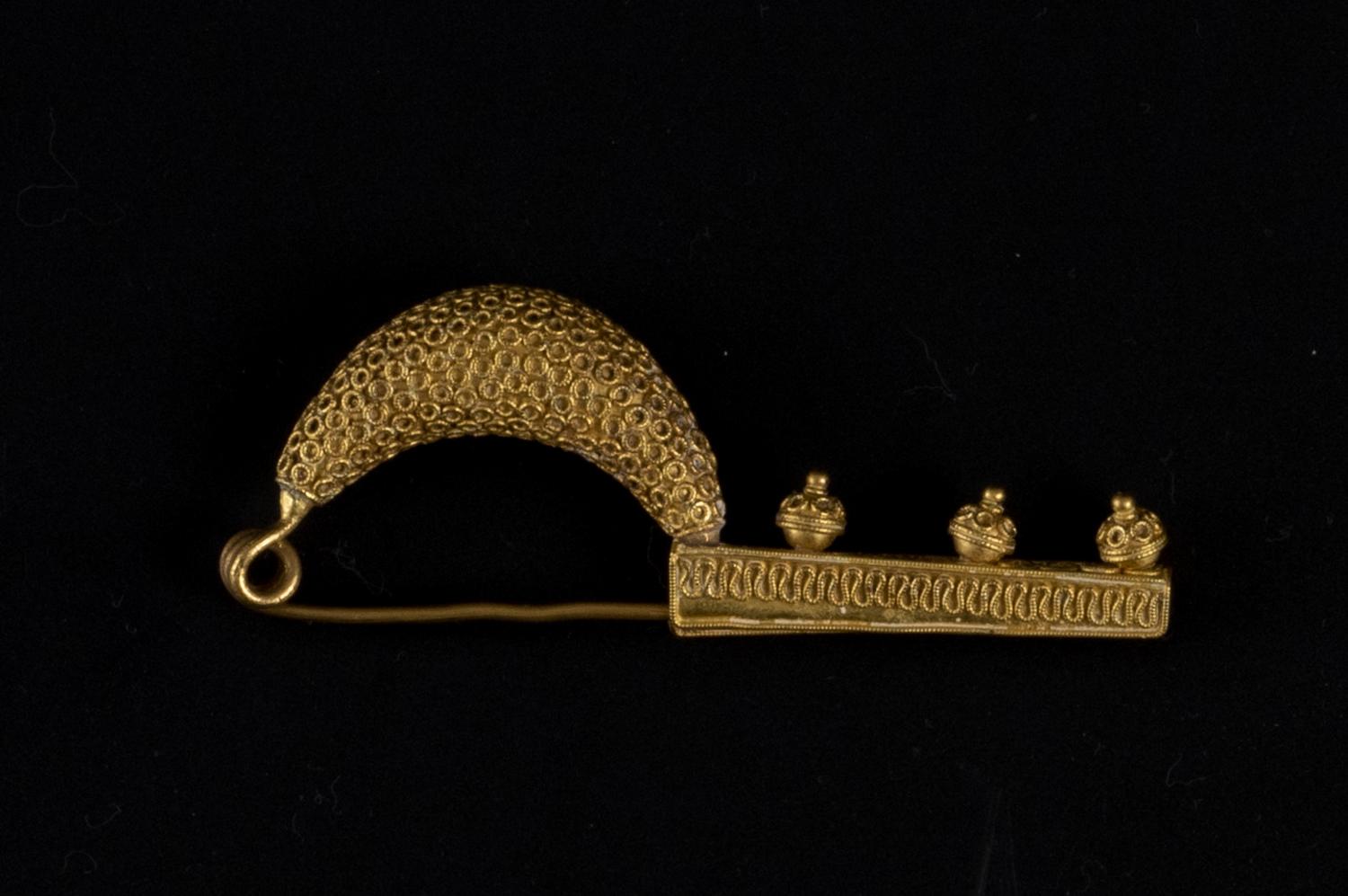 Grande fibula a staffa lunga con arco a sanguisuga decorato da cerchielli; staffa decorata a granulazione con motivo ad onda.