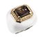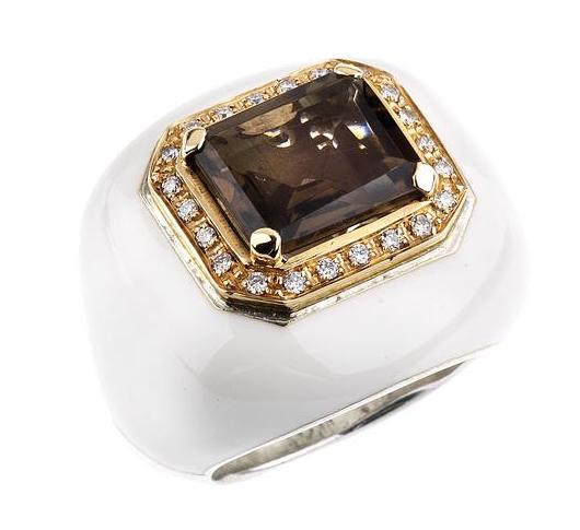 fascia bombata decorata in smalto bianco e centrata da un castone ottagonale in oro e diamanti per ct 0.20 entro cui è montato un quarzo fumè, punzone 925, misura 16, g 28