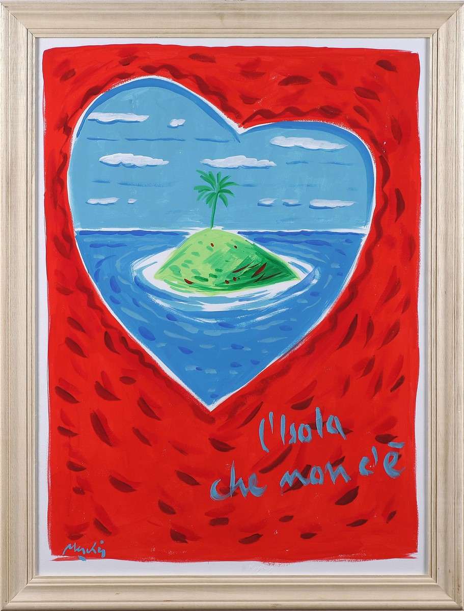 RENZO MESCHIS (n. 1945) L'isola che non c'è. Tecnica mista su carta. Cm 55,00 x 75,00. Firma in basso a sinistra. Autentica dell'artista su fotografia. Cornice presente