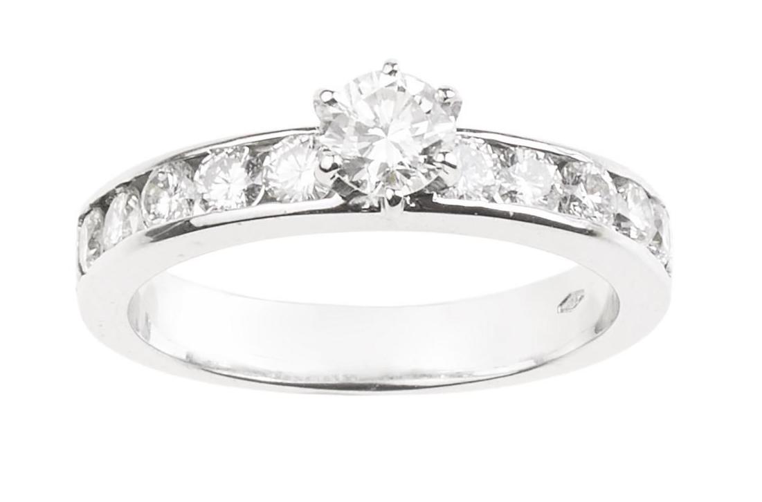 al centro un diamante di forma rotonda a brillante di ct 0.52 circa, colore G, purezza VS2, impreziosito ai lati da dieci diamanti per ct 1 totali circa, punzone 750, mis 20, g 6,3