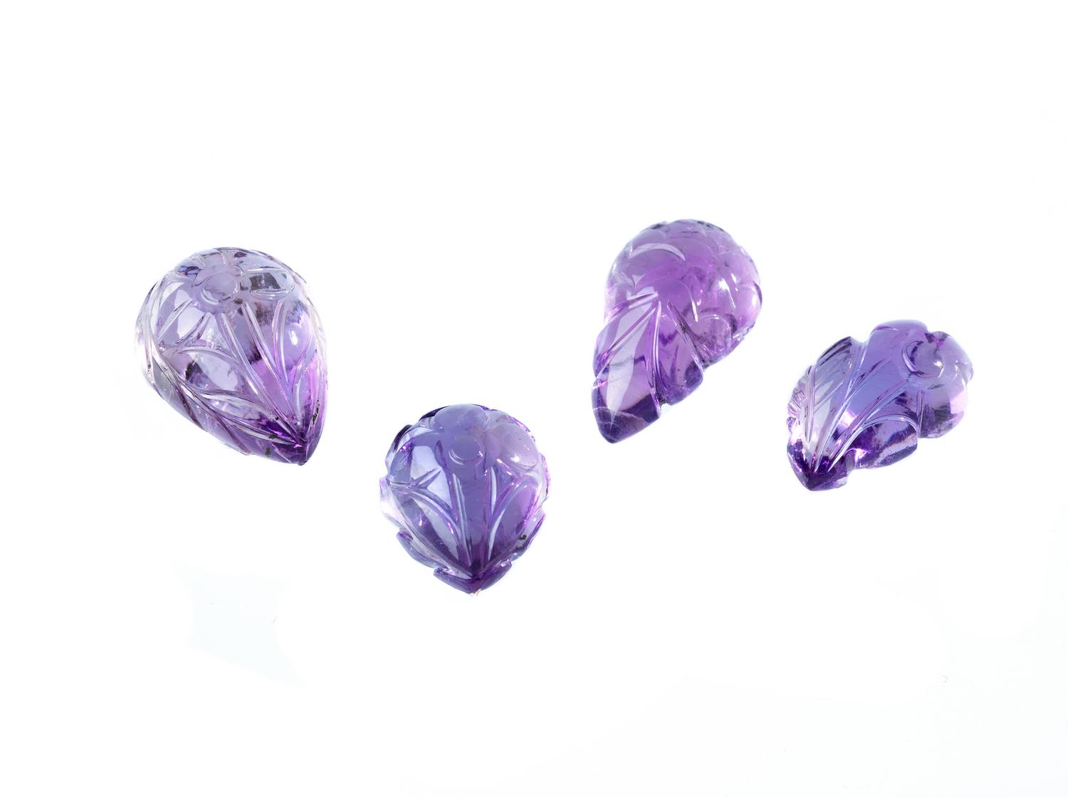 Lotto 81 | LOTTO DI QUATTRO AMETISTE INTAGLIATE PER CT 75.17 di forma a goccia, mm...