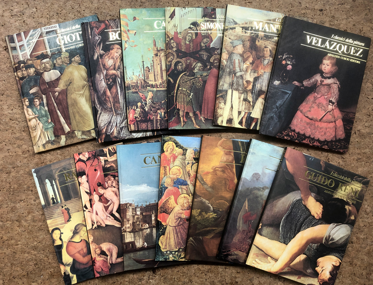 Lotto unico di 13 cataloghi, editi per la collana 'I Classici della Pittura' diretta da Maurizio Fagiolo dell'Arco, inerenti i seguenti artisti: Botticelli, Carpaccio, Simone Martini, Mantegna, Velazquez, Raffello, Bosch, Canaletto, Beato Angelico, Poussin, Turner, Guido Reni, Giotto
