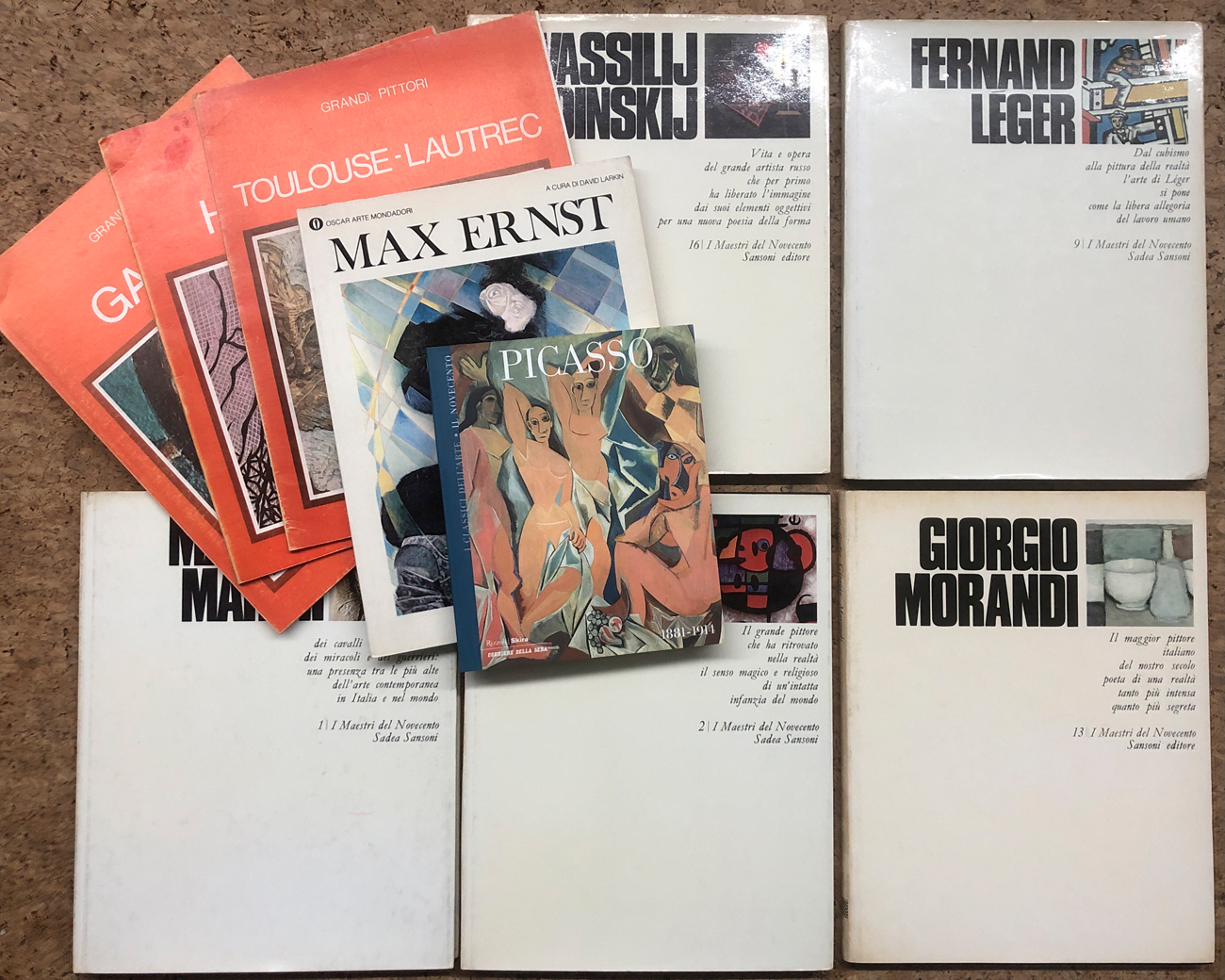 Lotto unico di 10 cataloghi tra cui 5 della serie 'I Maestri del Novecento - Sadea Sansoni' relativi ai seguenti artisti: Marino Marini, Joan Mirò, Giorgio Morandi, Fernand Léger, Vassilij Kandinskij; 3 della serie 'Grandi Pittori - Edizioni Scala' relativi ai seguenti artisti: Gauguin, Hokusai, Toulouse-Lautrec