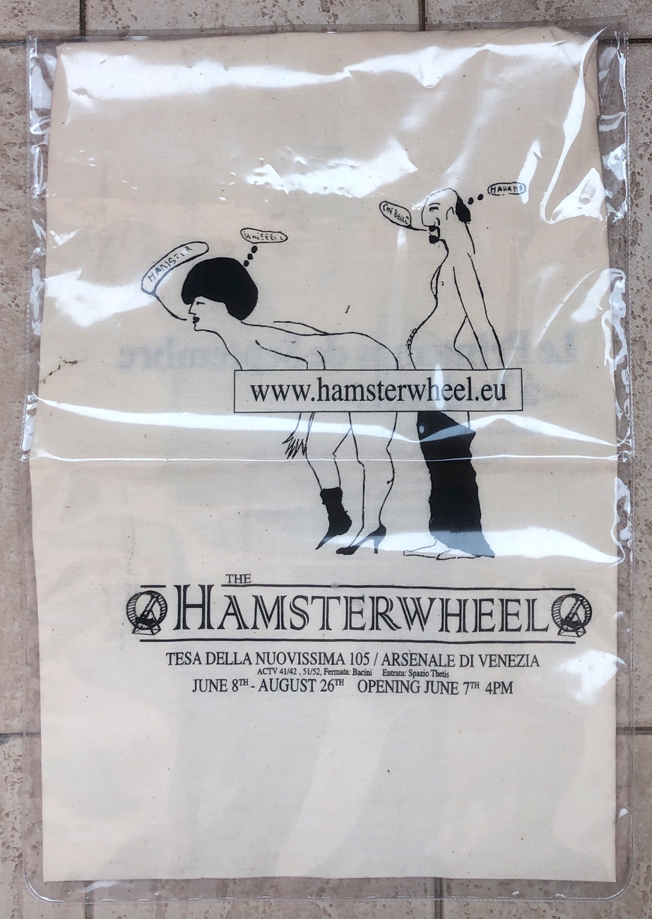 Si allega uno shopper in tela 'The Hamster wheel' realizzato in occasione dell'esposizione tenutasi presso Tesa della Nuovissima, Arsenale di Venezia, 2007