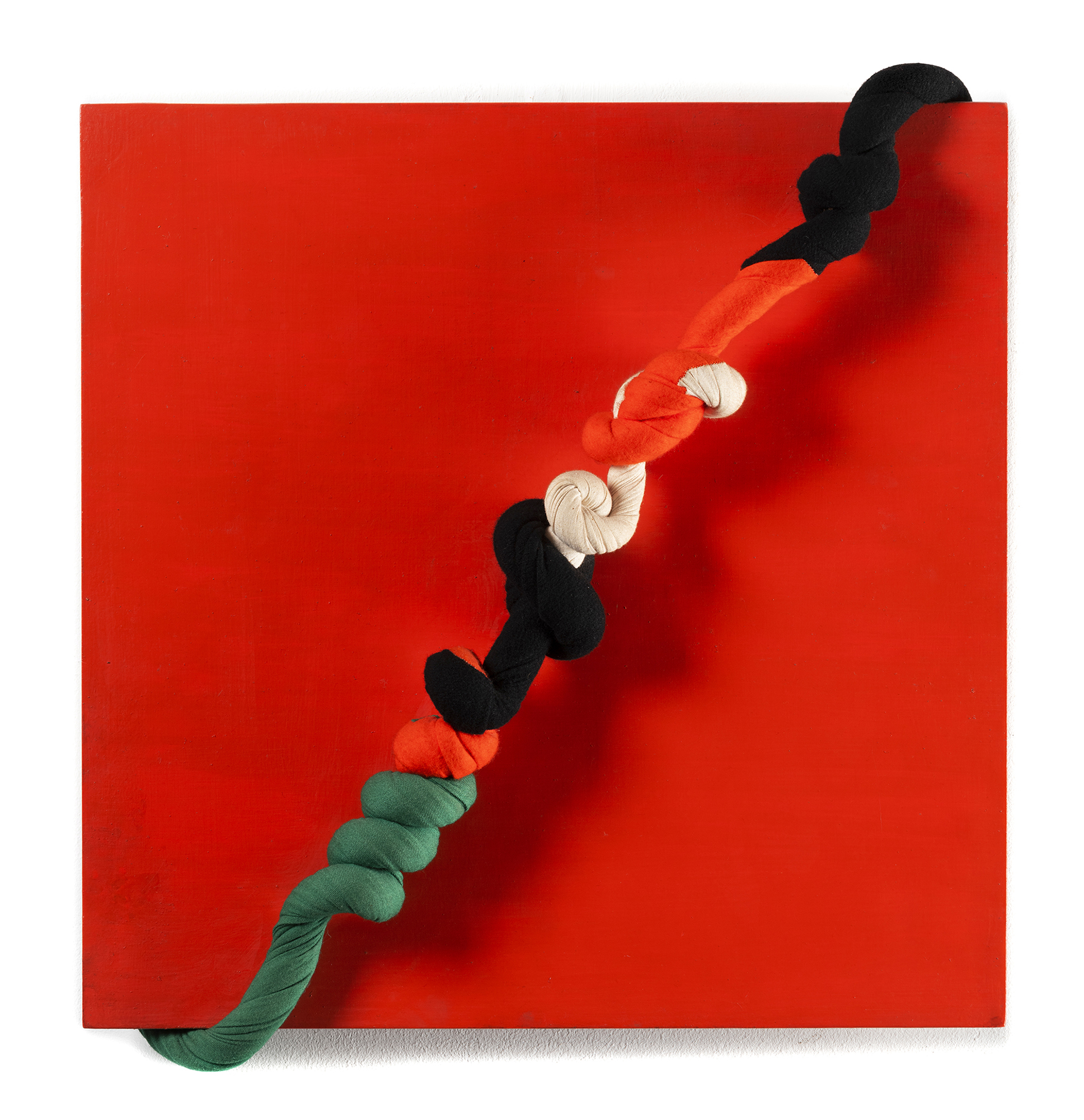 Tessuti cuciti e intrecciati applicati su tavola dipinta, cm. 50 x 47