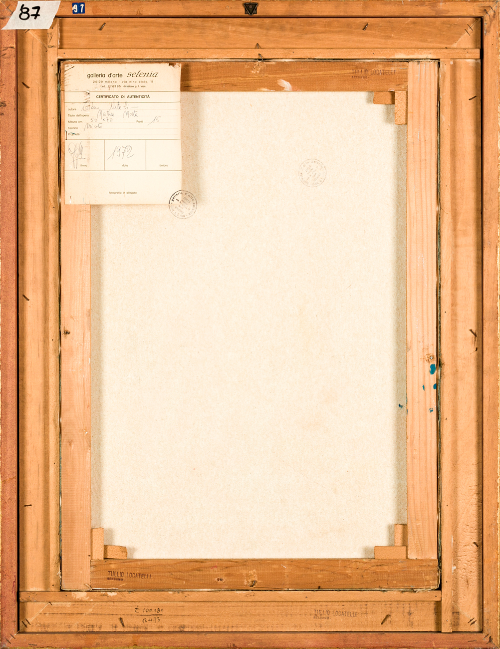 Timbri e cartiglio della Galleria d'Arte Selenia (MI) al retro