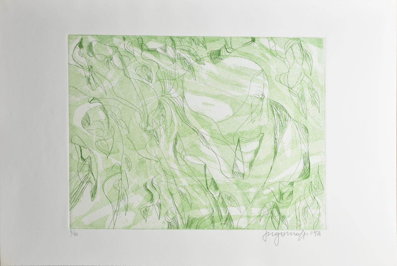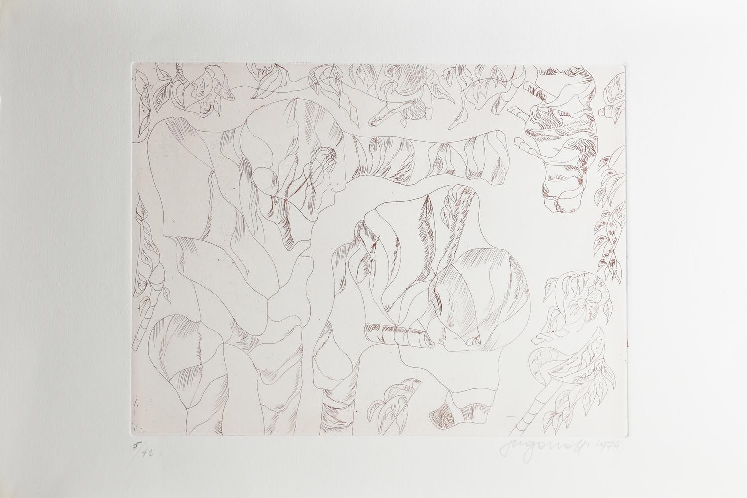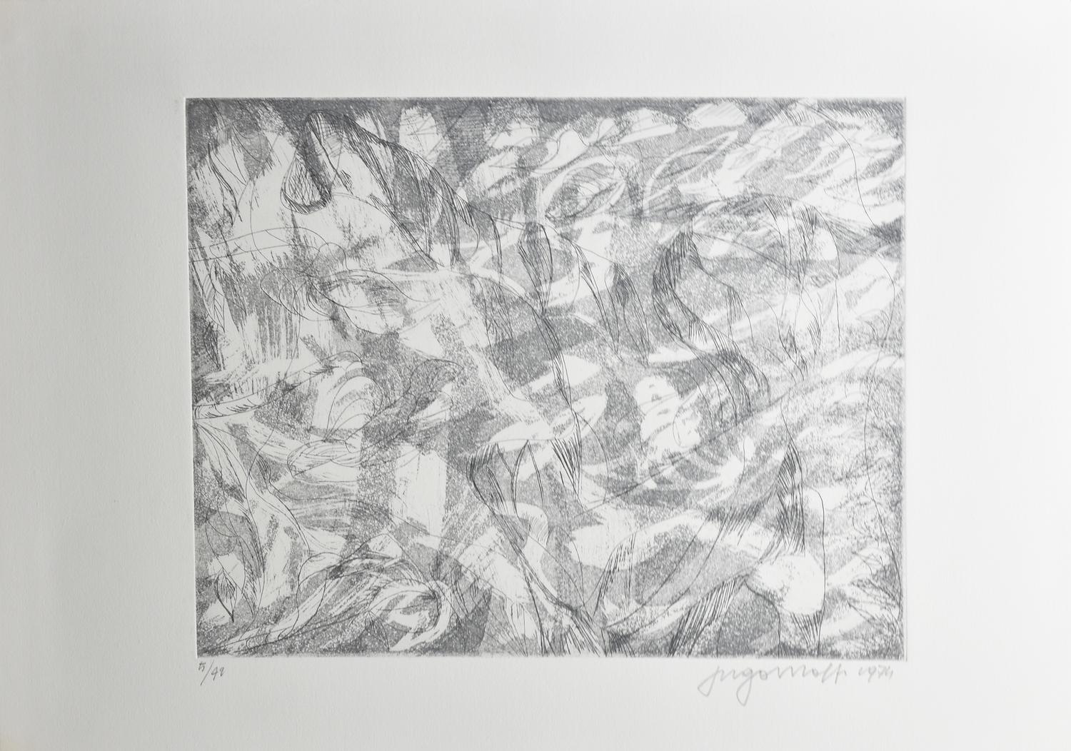 cartella contenente 3 acqueforti su carta, battuta cm 24,8x32, su foglio cm 34,3x50; es. 5/42