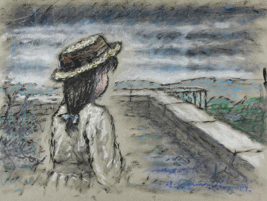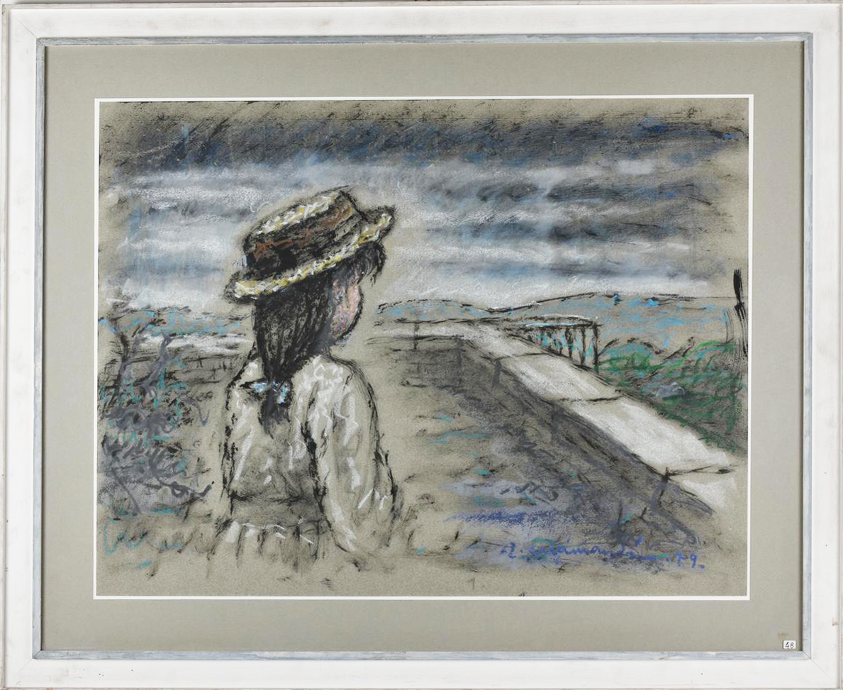 Enrico Allimandi CAPPELLINO DI PAGLIA tecnica mista su carta, cm 50x65 firma...
