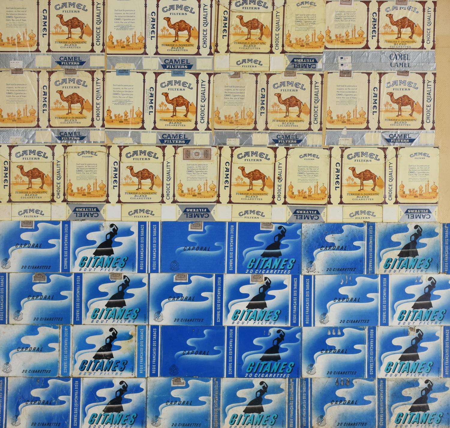 Lotto 19 | Dando CAMEL - GITANES collage di pacchetti di sigarette su cartoncino, cm 58x64