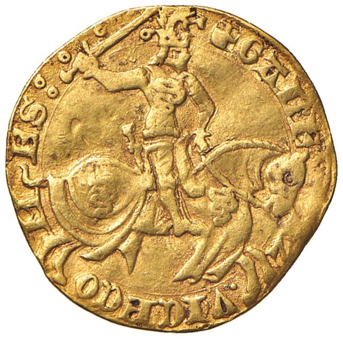 Fiorino o ducato, con il duca a cavallo a d., e scudo, elmo e cimiero.Crippa1. MIR 1/8.