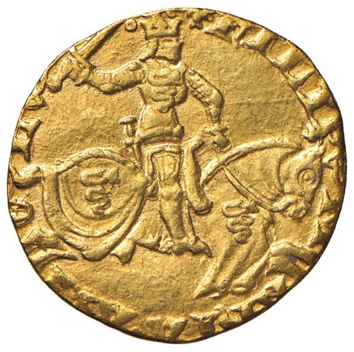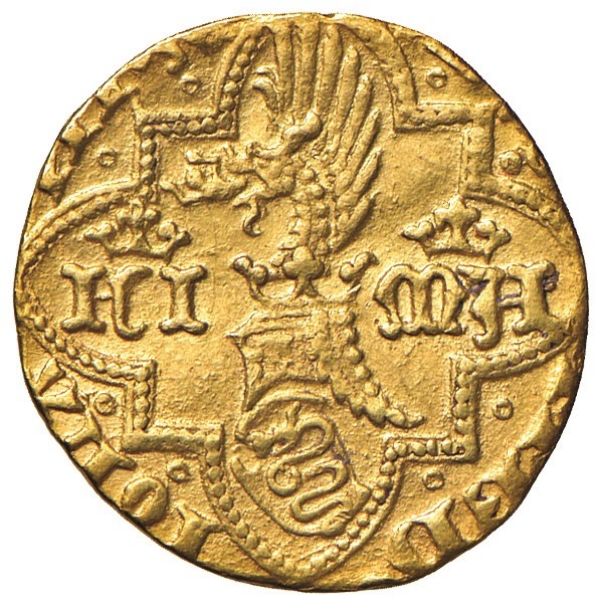 Fiorino o ducato, con il duca a cavallo a d., e scudo, elmo e cimiero.Crippa 1/B. MIR 150/1.