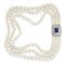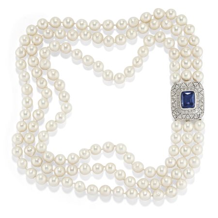 in oro bianco 18K, perle coltivate, zaffiro sintetico taglio cuscino, diamanti taglio brillante a decoro per totale ct 1,50 circa.