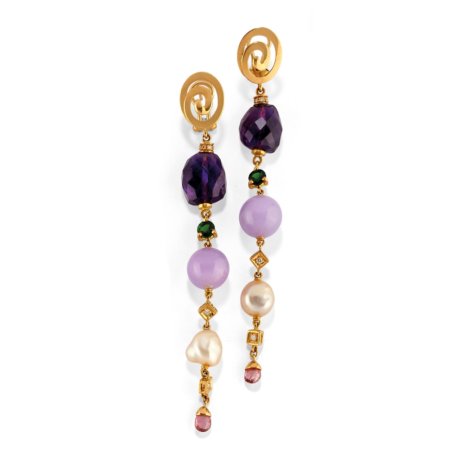 Lotto 256 | Orecchini pendenti con pietre colorate, perle coltivate e diamanti