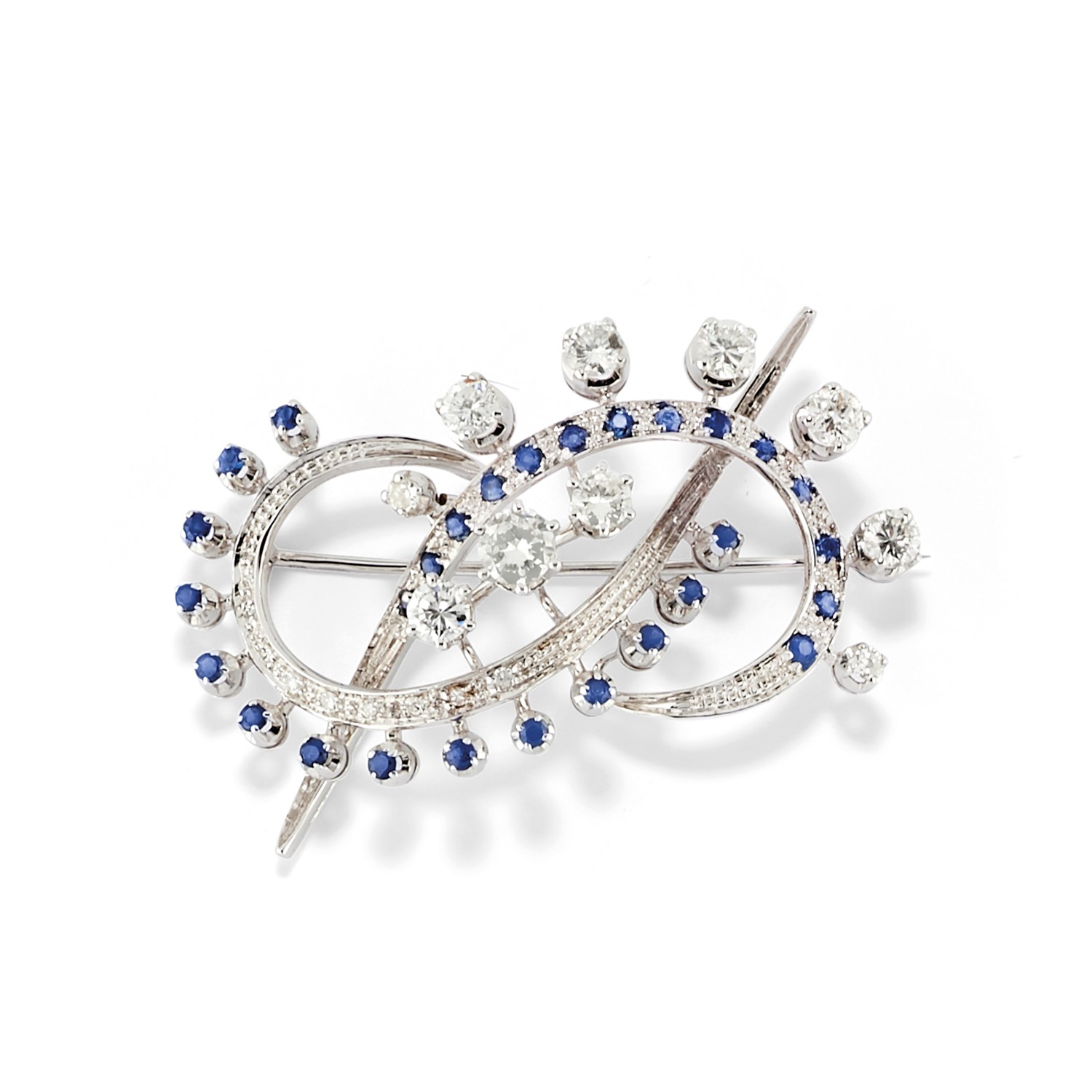 in oro bianco 18K, zaffiri taglio rotondo e diamanti taglio brillante e huit-huit per totale ct 1,80 circa.