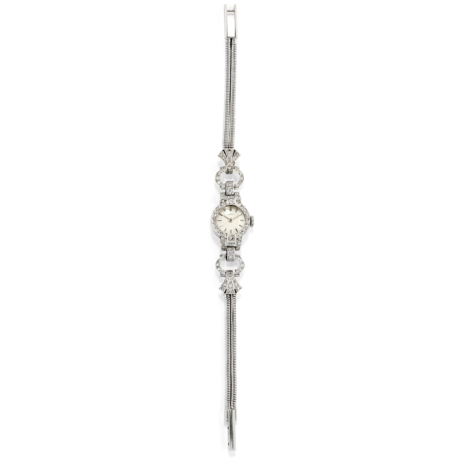 cassa rotonda, lunetta in diamanti taglio brillante e huit-huit, quadrante chiaro con indici applicati, movimento a carica manuale, difetti (fondello non originale).