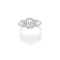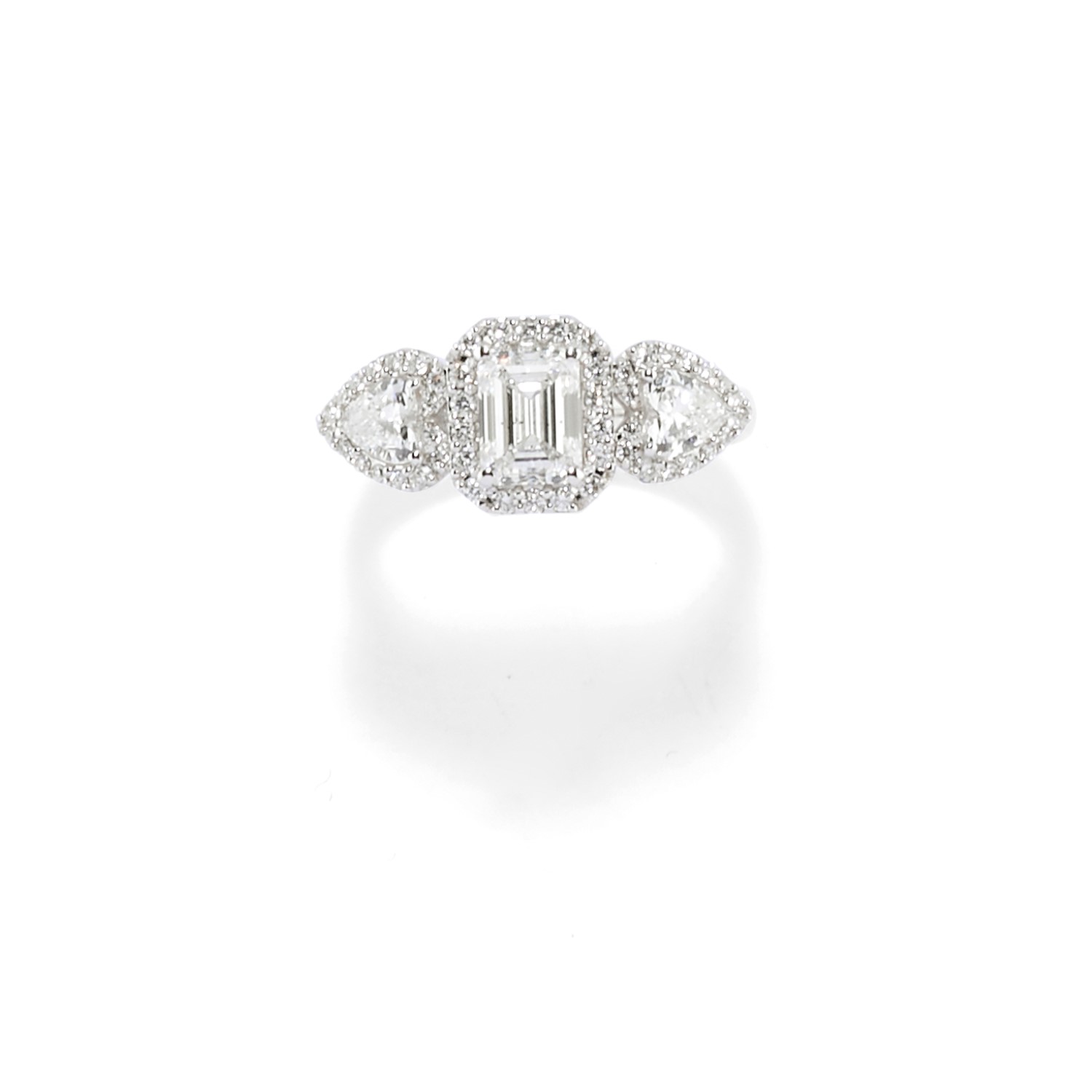 in oro bianco 18K, al centro diamante taglio smeraldo di ct 1,06, colore F, purezza SI, ai lati due diamanti taglio cuore per totale ct 0,50 circa, prob. colore F, purezza VS, contorno in diamanti taglio brillante per totale ct 0,30 circa.