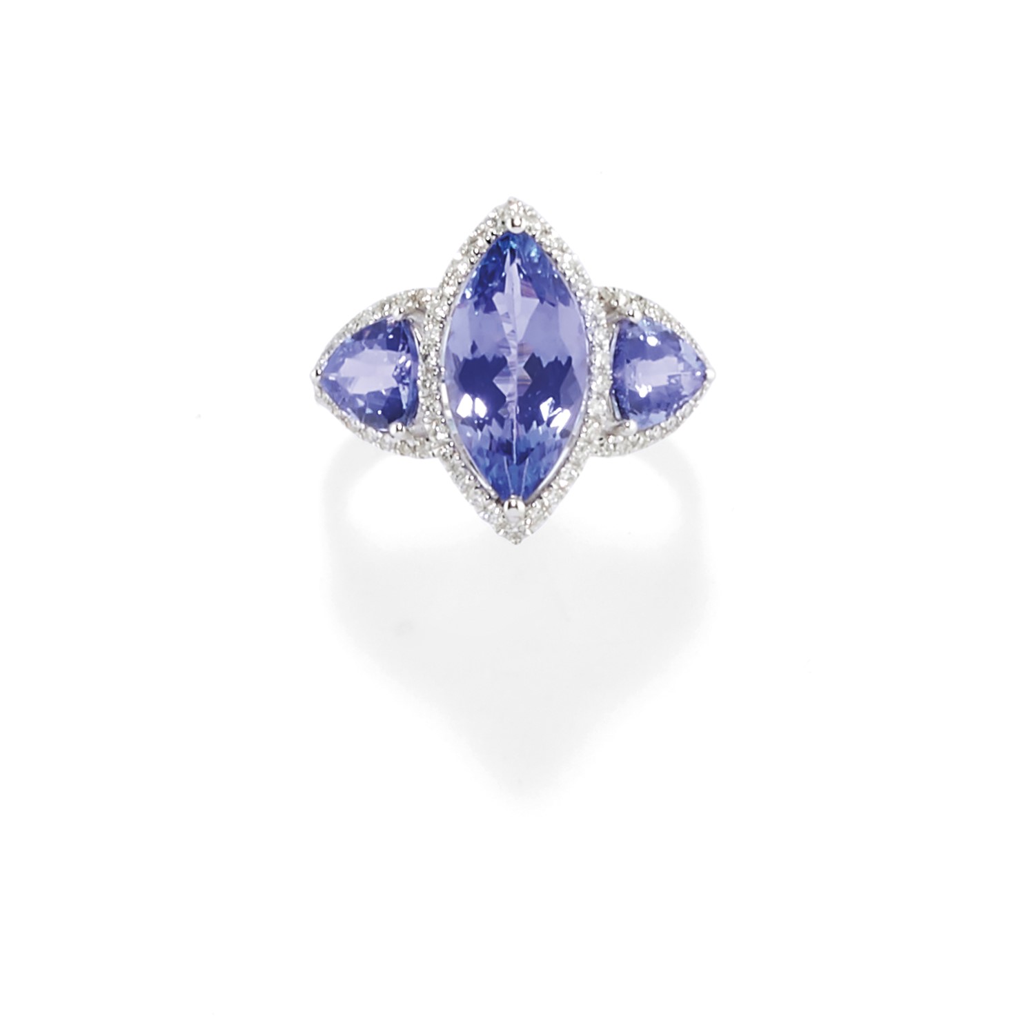 in oro bianco 18K, al centro tre tanzaniti taglio marquise e scudo per totale ct 4,00 circa e diamanti taglio brillante per totale ct 0,30 circa.