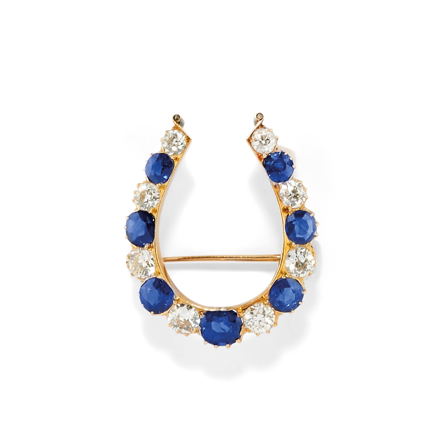 in oro giallo 18K, diamanti taglio vecchio per totale ct 2,00 circa e zaffiri taglio rotondo e ovale per totale ct 2,00 circa, a ferro di cavallo.