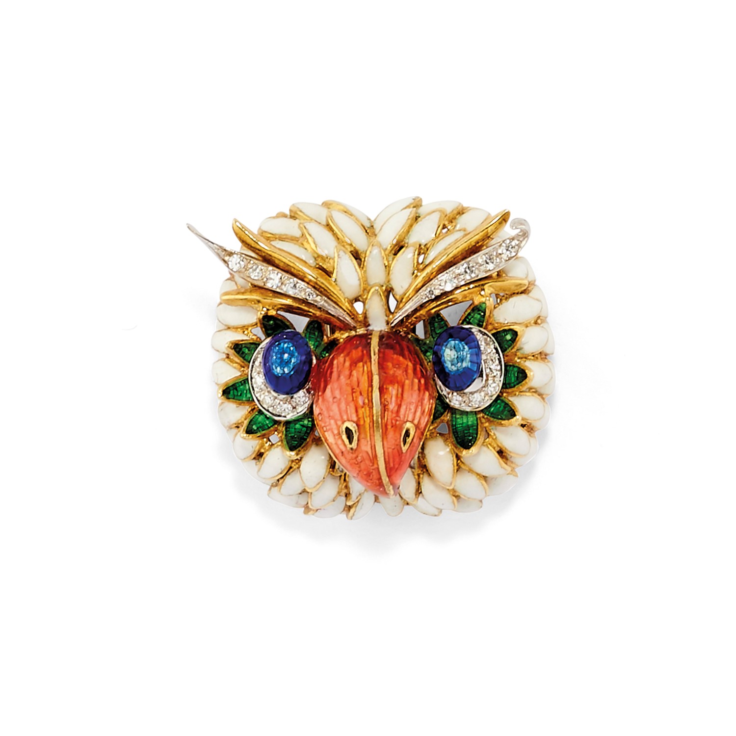 in oro giallo 18K, raffigurante gufo in smalto policromo.