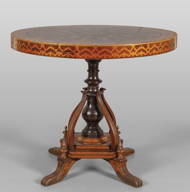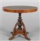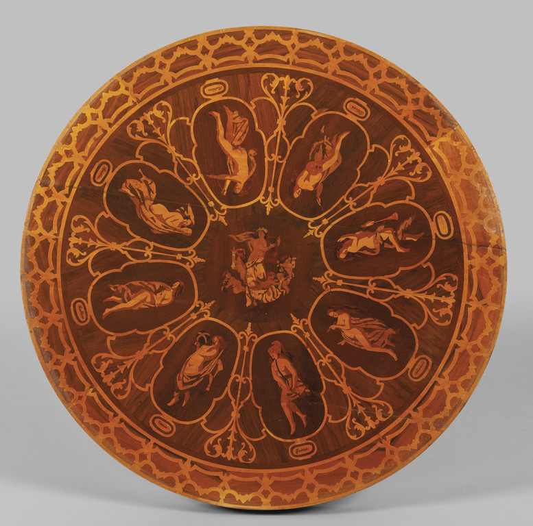 Tavolino lastronato in mogano ed intarsiato in acero con allegoria delle arti, sec. XIX