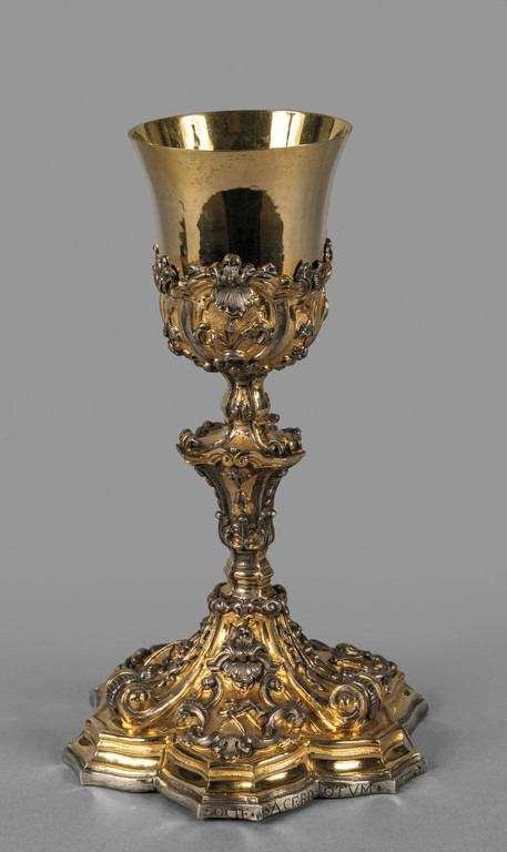 Calice in argento parzialmente dorato, nella base i simboli della Passione con scritta Socie Sacerdotum 1770, Roma sec.XVIII