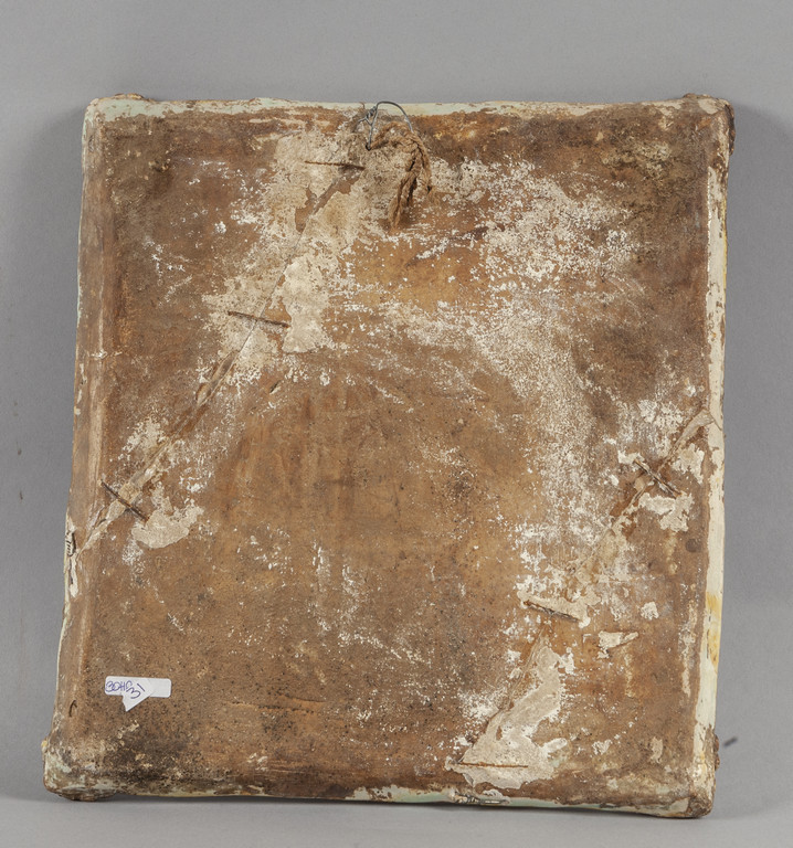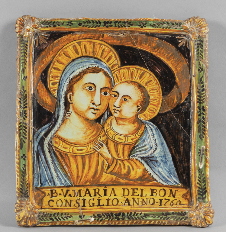 Placca in maiolica sbalzata raffigurante Maria del Buon Consiglio, d.ta 1762