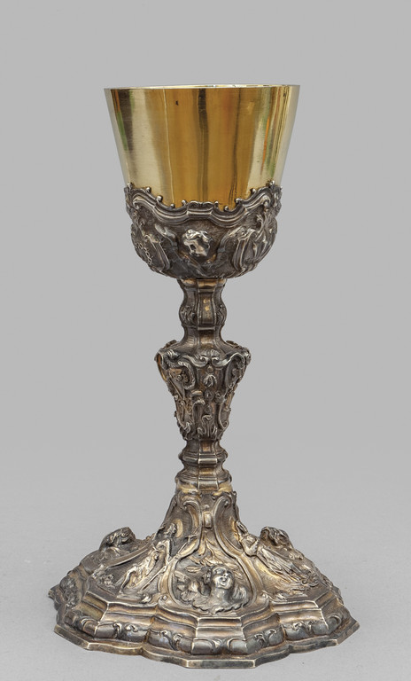 Calice in argento Luigi XV sbalzato con teste di Angeli e figure sacre, sec.XVIII