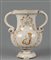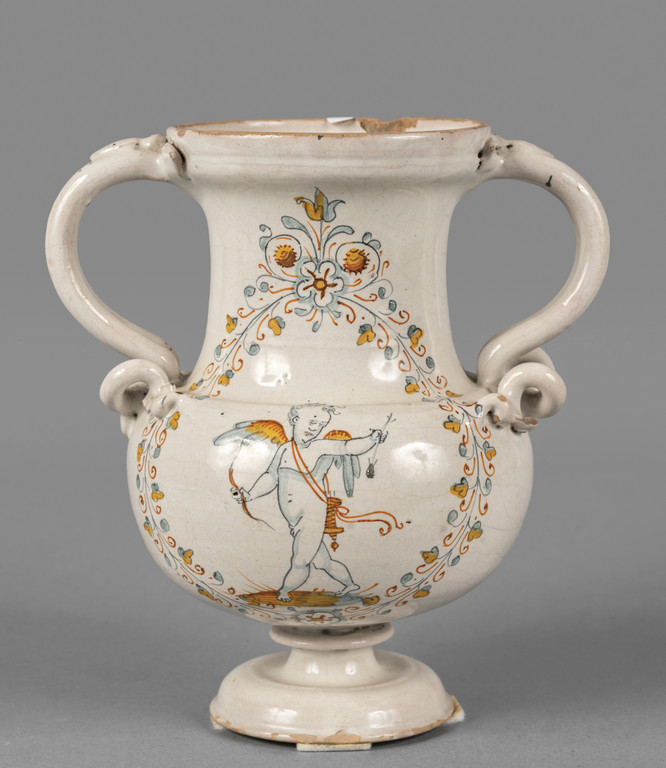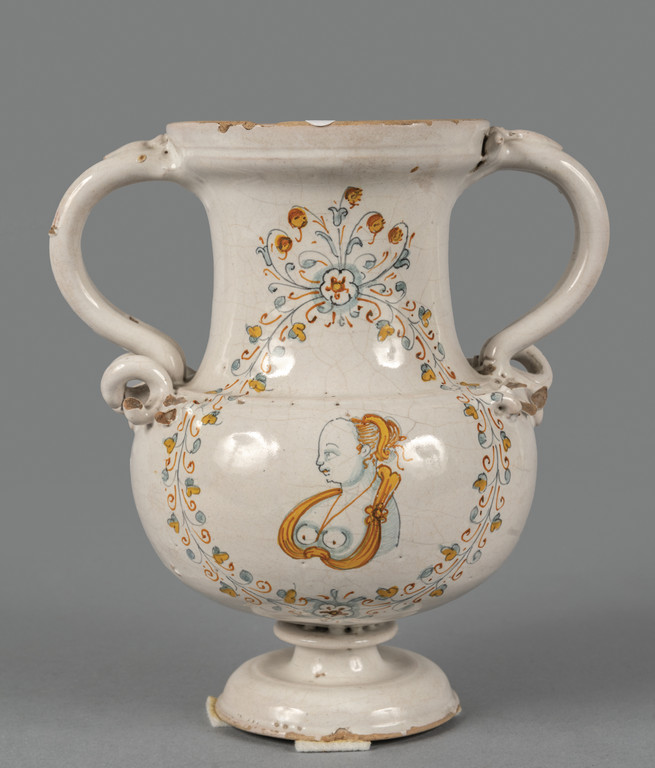 Brocca a due manici in maiolica decorata su due lati con angelo e profilo di dama, Faenza sec.XVIII